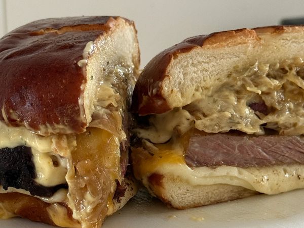 Stacked with tender smoked brisket, melted provolone, Sharp cheddar, and creamy Gouda. Layered with sweet caramelized onions and pressed between a toasted pretzel bun. Served with chips and warm J.A.M.BER infused beer cheese for dunking!